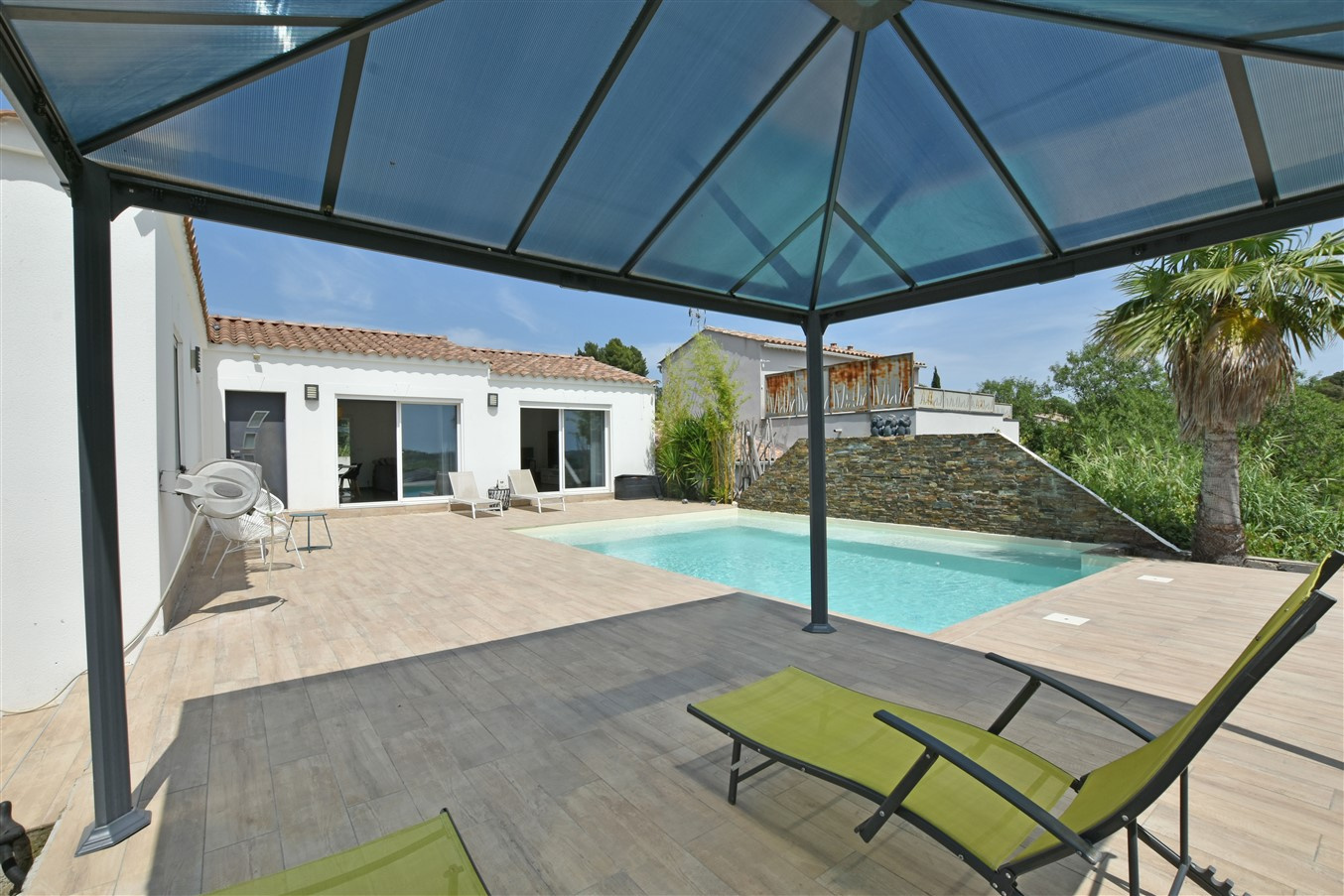 Villa de plain pied moderne P4 d'env. 132,53m2 située au calme avec vue dégagée, sur terrain d'env. 590m2 utiles. Exposée plein sud, elle offre une grande pièce vivre d'env. 70m2, lumineuse et traversante, avec cuisine semi-équipée avec îlot central, deux baies vitrées donnent sur la terrasse et la piscine. Pour la partie nuit, 3 chambres de 16,24m2, 12,91m2 et 12,6m2 ainsi qu'une grande salle de bain/douche italienne de 11,62m2 et wc séparés. Les extérieurs profitent d'une grande terrasse carrelé, entourant la piscine, pergola ombragée. Parking et garage de 25m2. Chauffage en climatisation gainable, volets roulants électriques centralisés. Idéalement située, à env. 30mn de la mer, env. 15mn d'Arles et 20mn de Nîmes. Contact : Bruno Charlier 06.98.42.28.68. Honoraires charge vendeurs.